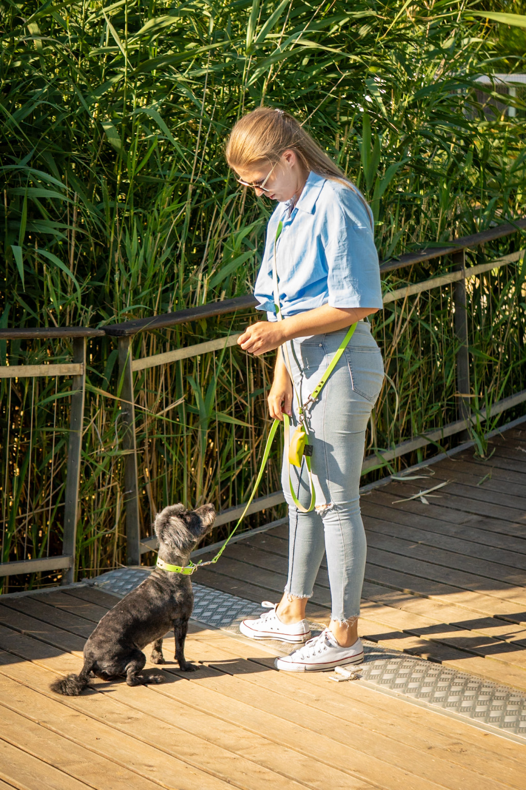 A karabiner átkattintásával szabhatod meg a póráz hosszát, amelyhez több rögzítési pont is a rendelkezésedre áll, így minden szituációhoz kényelmes méretet választhatsz. Állítható pórázaink teljes hossza 200 cm, 250 cm vagy 300 cm így utóbbi két méret esetén akár kényelmesen a vállad vagy derekad köré akaszthatod , hogy a séta során mindkét kezed szabad maradjon.