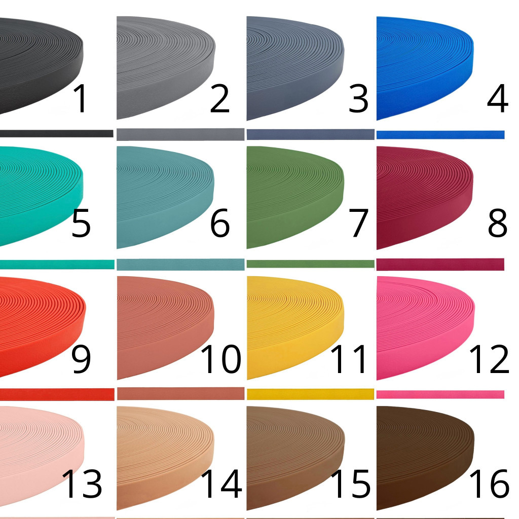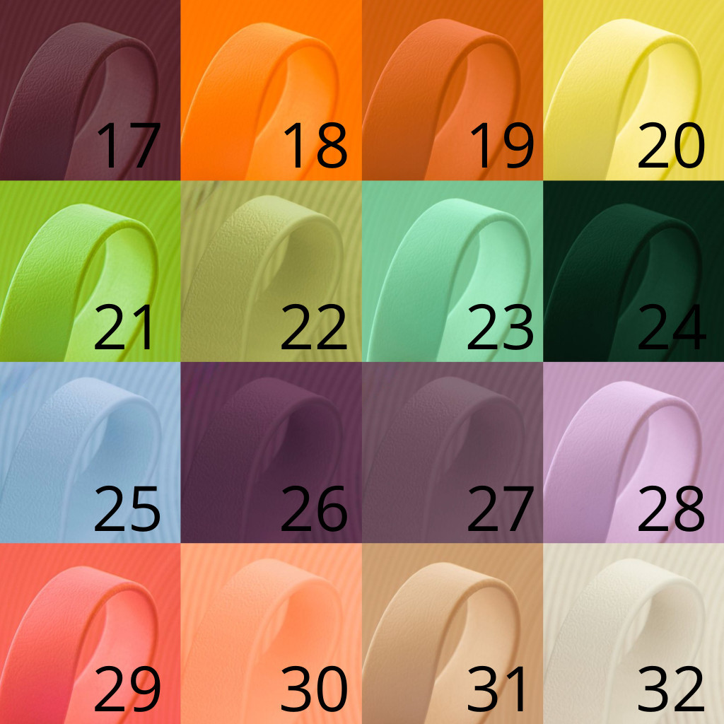 BioThane: 17 Wine, 18 Neon Orange, 19 Orange, 20 Pastel Yellow, 21 Apple Green, 22 Guacamole, 23 Ice, 24 Forest, 25 Baby Blue, 26 Aubergin, 27 Mauve, 28, Lilac, 29 Coral, 30 Peach, 31 Champagne, 32 Ecru